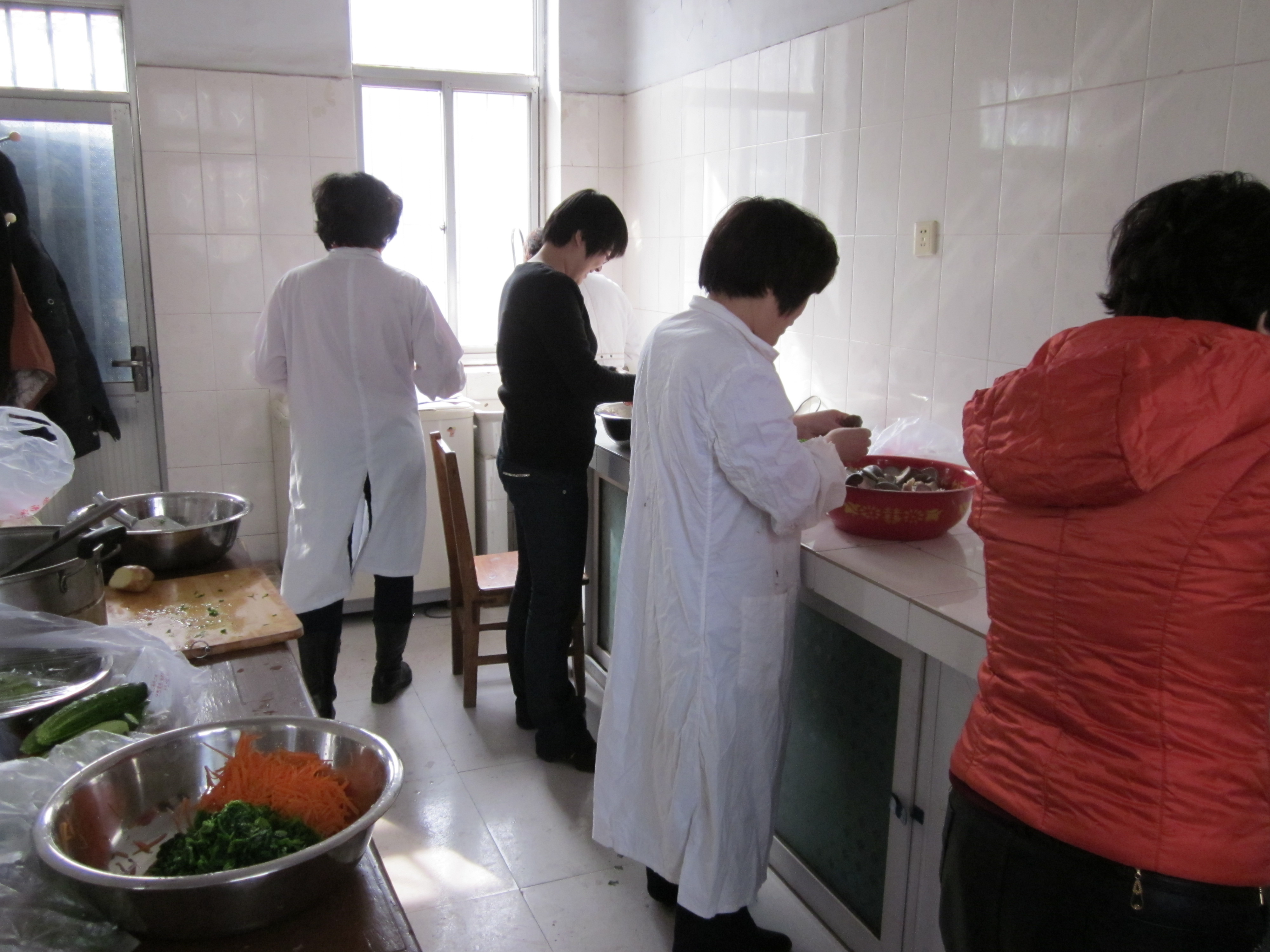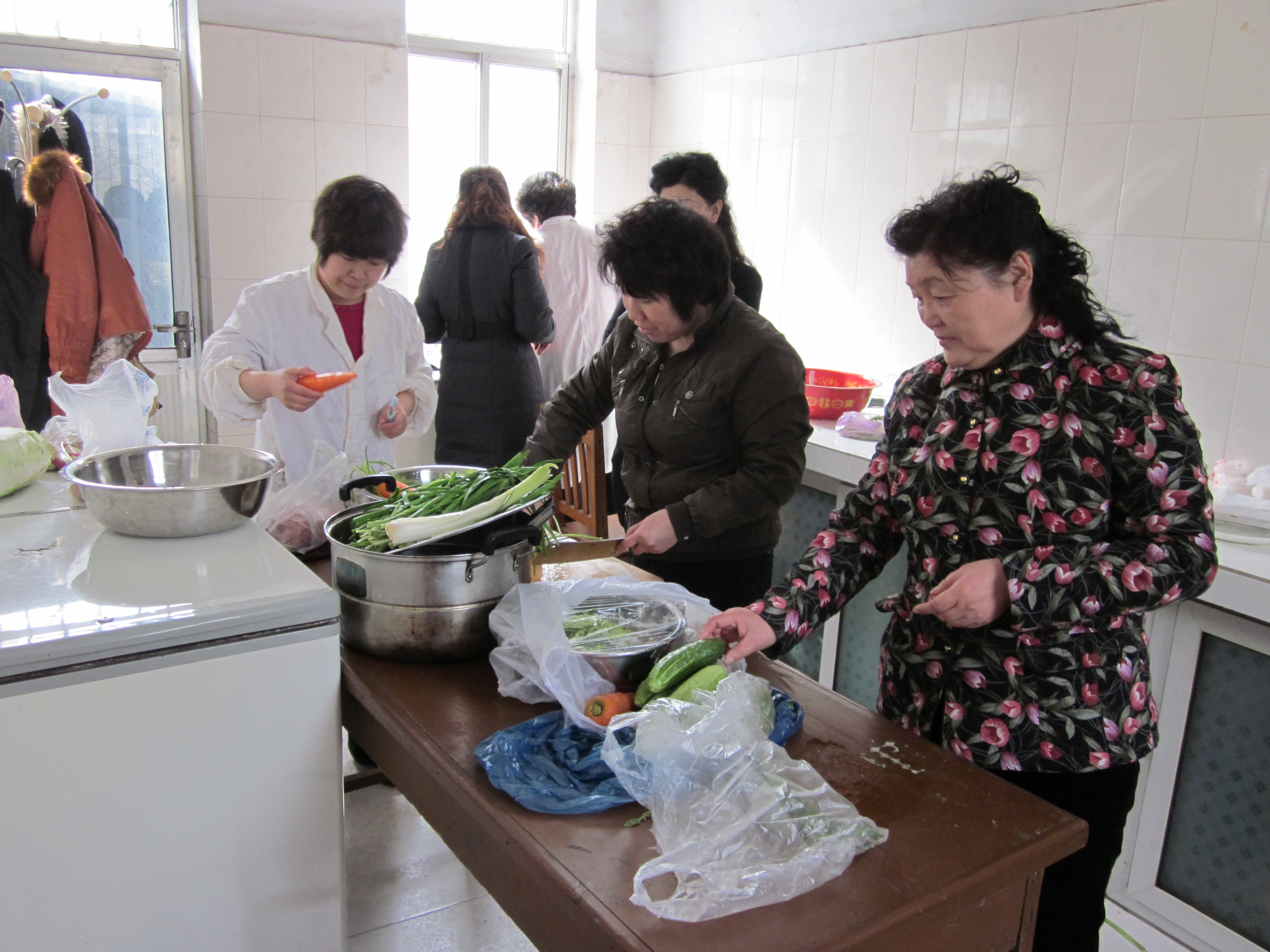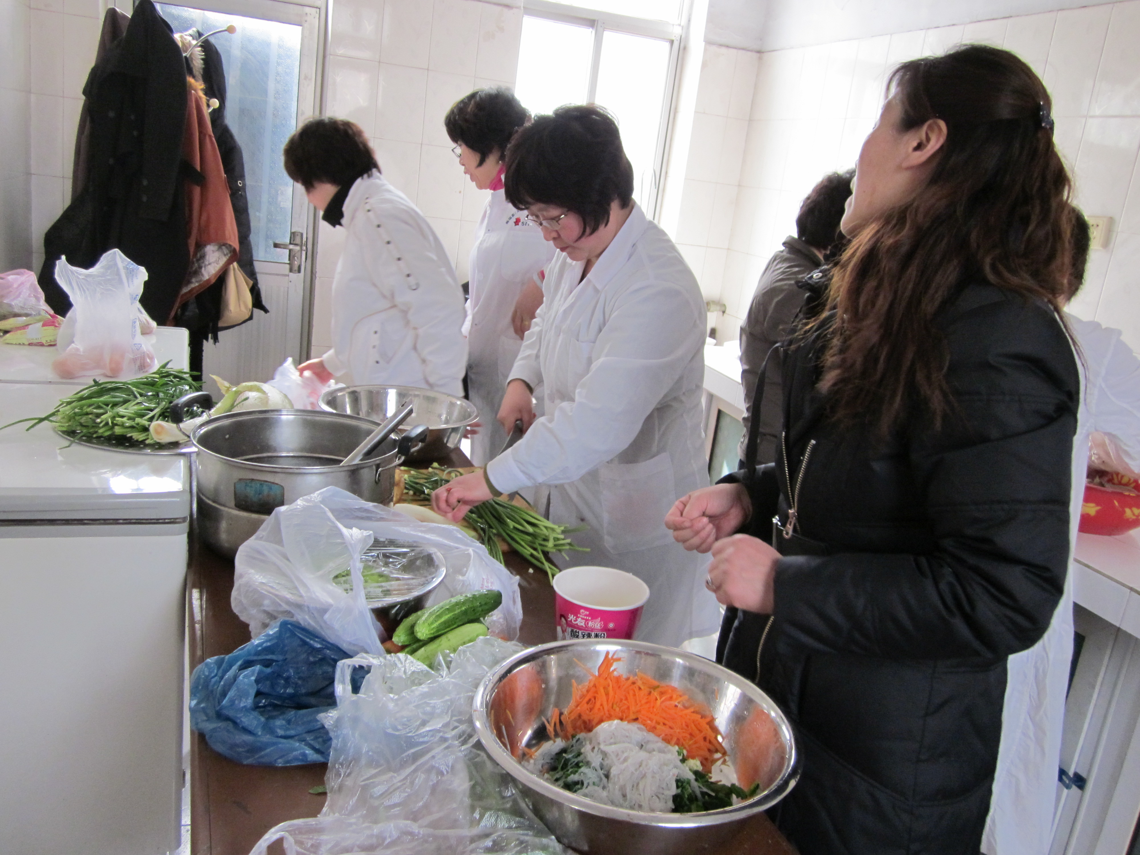 左右没课的女教师自发组成小组开始为中午的厨艺大赛兼品尝盛宴做准备,大家齐动手和面、洗菜、