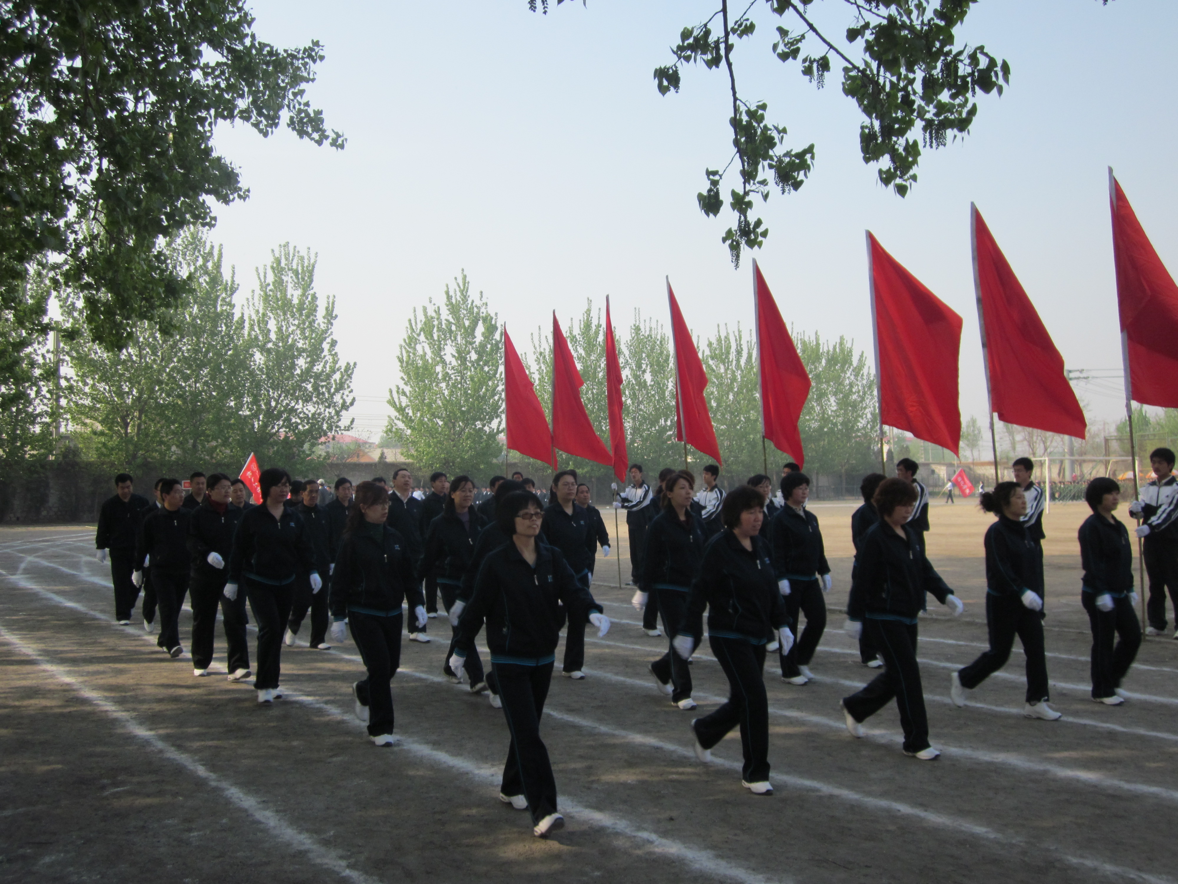 图为公司教职工身着统一的服装,迈着整齐的步伐走过主席台前